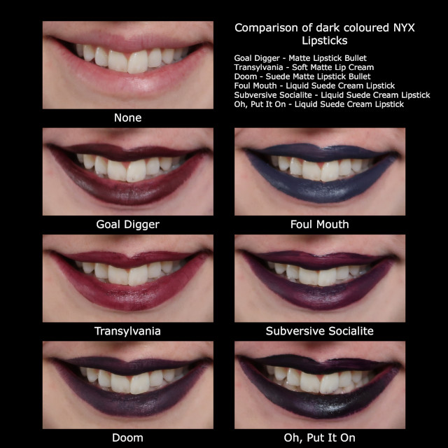 I've tried several of NYX's darker-coloured lipsticks, listed below. The colour descriptions are based on my observations, not how the company describe them.